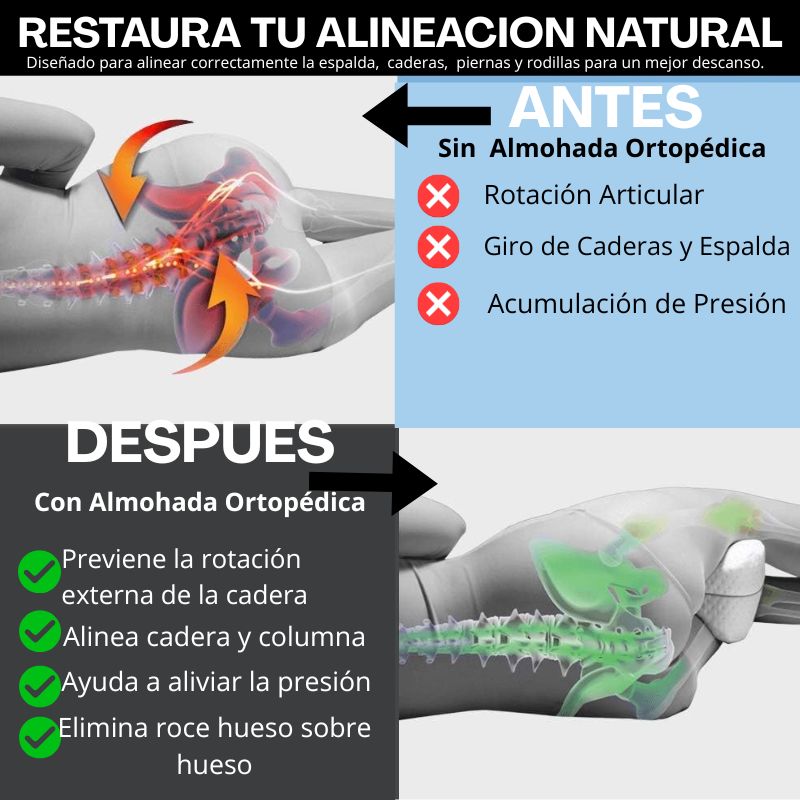 Cuando te acuestas de lado y deja una pierna sobre la otra, tu columna se tuerce, la pelvis se desajusta y tus rodillas chocan como si pelearan... Resultado: dolores, insomnio y cero descanso .