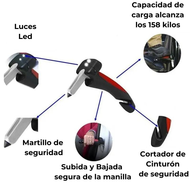 la ventaja para levantarte. El agarre antideslizante es cómodo de sostener y al mismo tiempo te brinda un agarre práctico para máxima seguridad. Su diseño único está preparado para todas las situaciones e incluye un rompe parabrisas, un cortador de cinturón de seguridad, una linterna LED súper brillante.